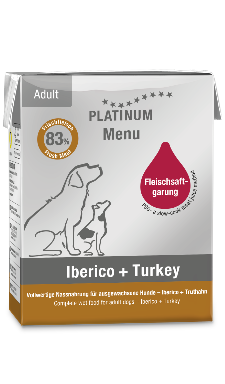 PLATINUM MENU Adult Iberico+Turkey to wysokomięsna karma mokra, która zawiera aż 83% świeżej wieprzowiny iberyjskiej i indyka. Przygotowana metodą FSG (Fleischsaftgarung) – powolnego gotowania mięsa we własnych sokach, bez dodatku wody. Dzięki temu jest wyjątkowo aromatyczna, lekkostrawna i doskonale przyswajalna.