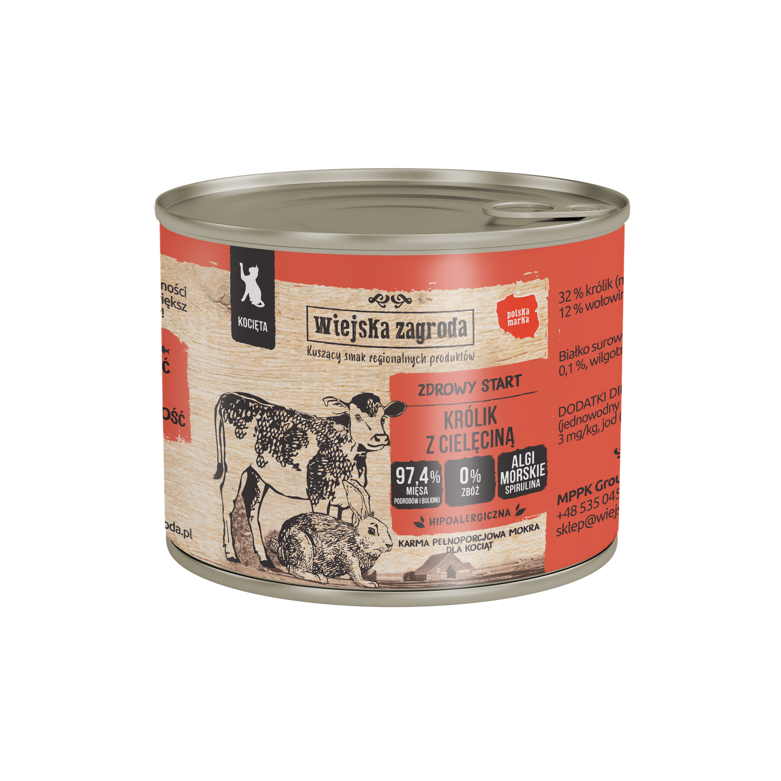 Wiejska Zagroda Królik z Cielęciną to naturalna, bezzbożowa karma stworzona z myślą o zdrowym rozwoju kociąt. Zawiera duet delikatnych mięs – królika i cielęciny, które dostarczają lekkostrawnego białka, żelaza i fosforu, niezbędnych w okresie wzrostu.